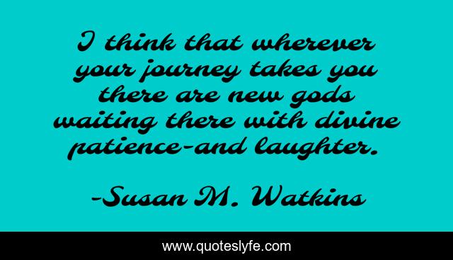 This page presents the quote "I think that wherever your journey takes you there are new gods waiting there with divine patience-and laughter.". Author of this quote is Susan M. Watkins. .
