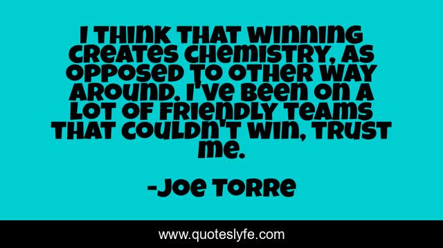 This page presents the quote "I think that winning creates chemistry, as opposed to other way around. I've been on a lot of friendly teams that couldn't win, trust me.". Author of this quote is Joe Torre. This quote is about me, win, winning,.