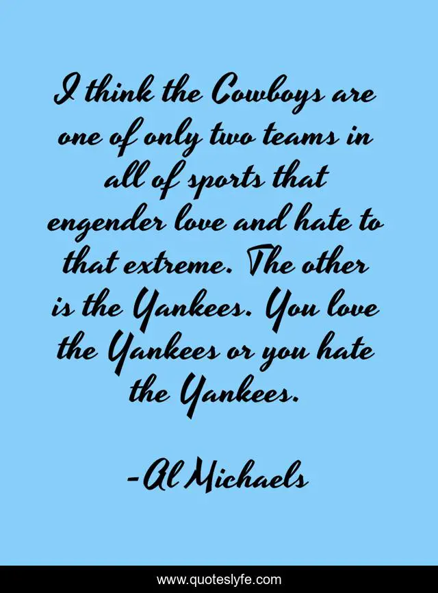 This page presents the quote "I think the Cowboys are one of only two teams in all of sports that engender love and hate to that extreme. The other is the Yankees. You love the Yankees or you hate the Yankees.". Author of this quote is Al Michaels. This quote is about love, hate, think, affection,.