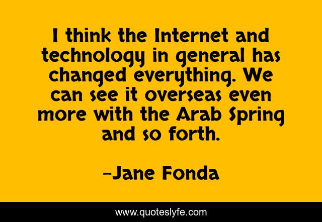 This page presents the quote "I think the Internet and technology in general has changed everything. We can see it overseas even more with the Arab Spring and so forth.". Author of this quote is Jane Fonda. This quote is about spring, think, internet,.