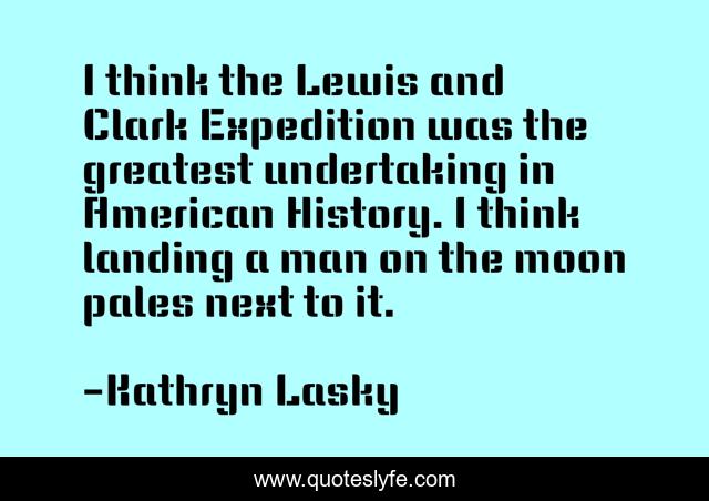 This page presents the quote "I think the Lewis and Clark Expedition was the greatest undertaking in American History. I think landing a man on the moon pales next to it.". Author of this quote is Kathryn Lasky. This quote is about american, man, moon,.