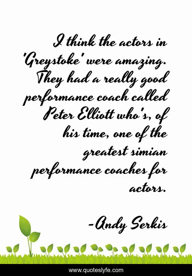 This page presents the quote "I think the actors in 'Greystoke' were amazing. They had a really good performance coach called Peter Elliott who's, of his time, one of the greatest simian performance coaches for actors.". Author of this quote is Andy Serkis. This quote is about performance, good, time,.