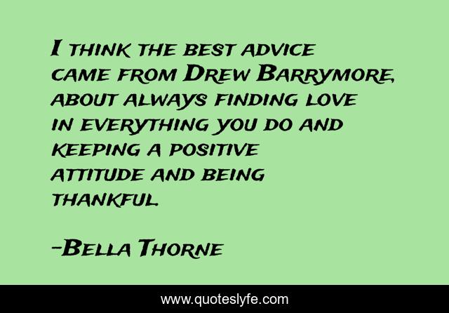 This page presents the quote "I think the best advice came from Drew Barrymore, about always finding love in everything you do and keeping a positive attitude and being thankful.". Author of this quote is Bella Thorne. This quote is about positive, confidence, love, affection, thankful,.