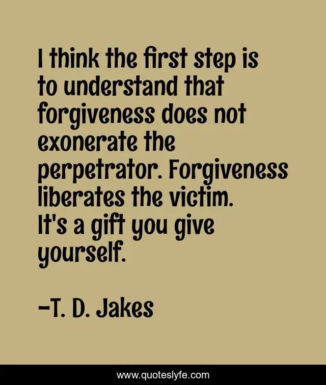 This page presents the quote "I think the first step is to understand that forgiveness does not exonerate the perpetrator. Forgiveness liberates the victim. It's a gift you give yourself.". Author of this quote is T. D. Jakes. This quote is about step, gift, yourself,.