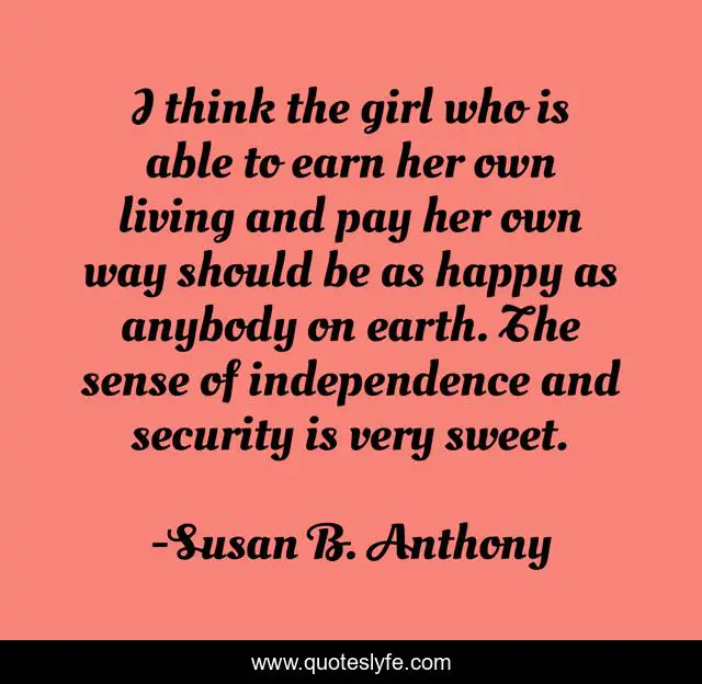 This page presents the quote "I think the girl who is able to earn her own living and pay her own way should be as happy as anybody on earth. The sense of independence and security is very sweet.". Author of this quote is Susan B. Anthony. This quote is about suffrage, self-reliance, feminism,.