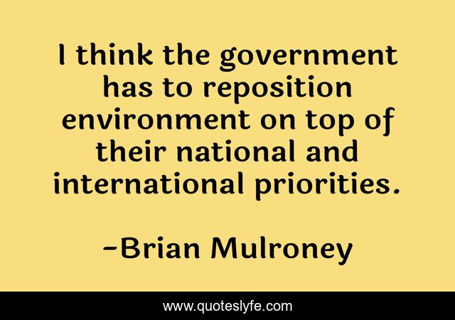 This page presents the quote "I think the government has to reposition environment on top of their national and international priorities.". Author of this quote is Brian Mulroney. This quote is about environment, government,.