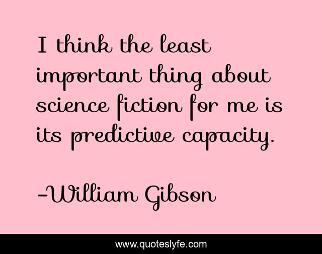This page presents the quote "I think the least important thing about science fiction for me is its predictive capacity.". Author of this quote is William Gibson. This quote is about me, important, think,.