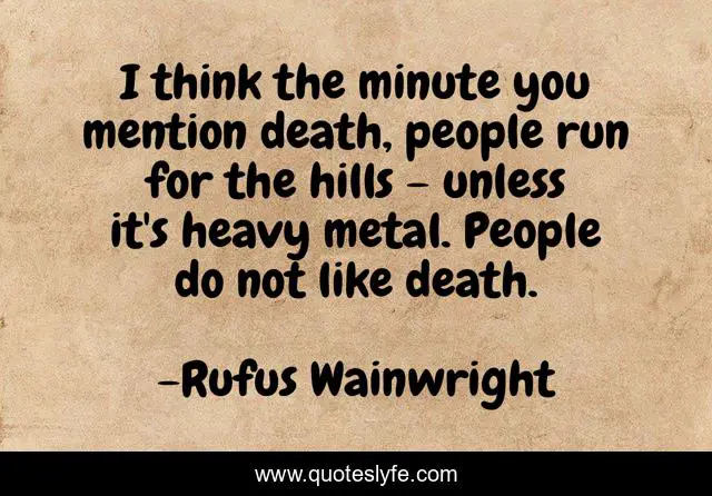 This page presents the quote "I think the minute you mention death, people run for the hills - unless it's heavy metal. People do not like death.". Author of this quote is Rufus Wainwright. This quote is about think, people,.