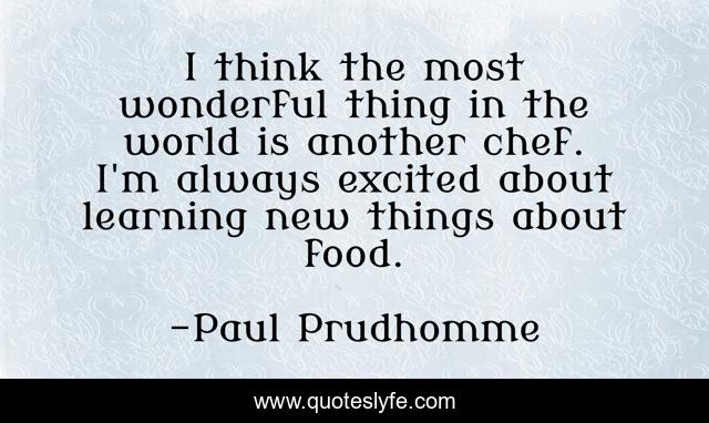 This page presents the quote "I think the most wonderful thing in the world is another chef. I'm always excited about learning new things about food.". Author of this quote is Paul Prudhomme. This quote is about food, world, chef,.