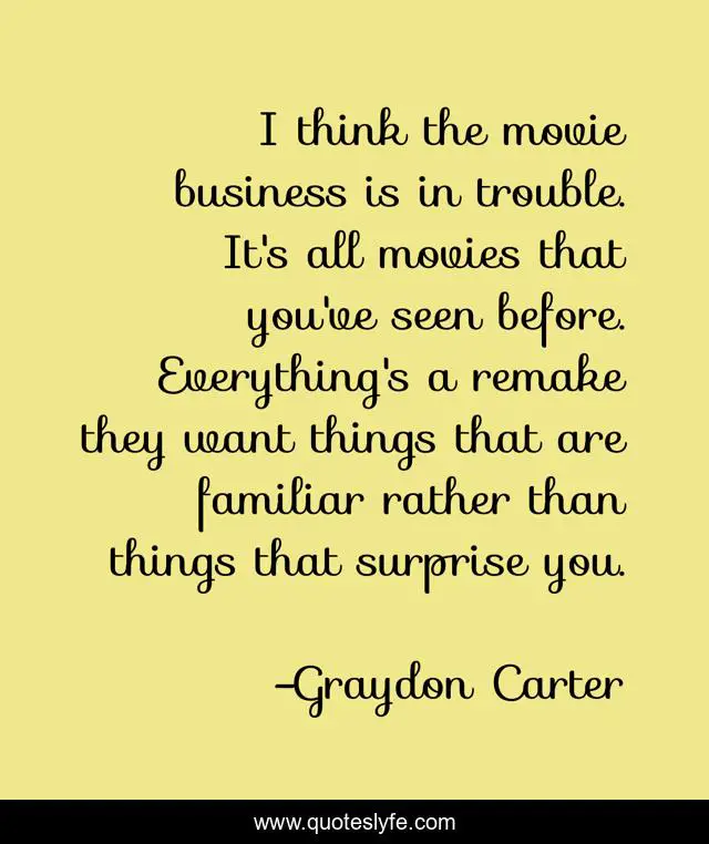 This page presents the quote "I think the movie business is in trouble. It's all movies that you've seen before. Everything's a remake they want things that are familiar rather than things that surprise you.". Author of this quote is Graydon Carter. This quote is about surprise, business,.