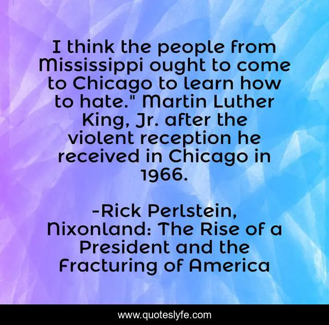 This page presents the quote "I think the people from Mississippi ought to come to Chicago to learn how to hate." Martin Luther King, Jr. after the violent reception he received in Chicago in 1966.". Author of this quote is Rick Perlstein, Nixonland: The Rise of a President and the Fracturing of America. This quote is about southerners, hate, northerners,.