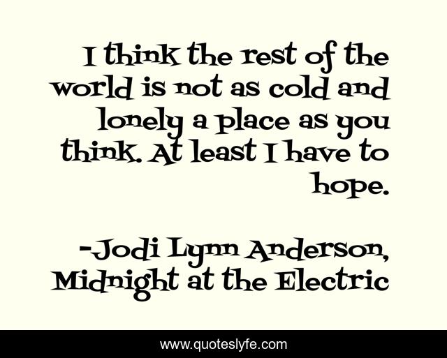 This page presents the quote "I think the rest of the world is not as cold and lonely a place as you think. At least I have to hope.". Author of this quote is Jodi Lynn Anderson, Midnight at the Electric. This quote is about midnight-at-the-electric, hope, inpirational, jodi-lynn-anderson,.