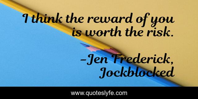 This page presents the quote "I think the reward of you is worth the risk.". Author of this quote is Jen Frederick, Jockblocked. This quote is about relationships, rewards, love, chances, risks, affection,.