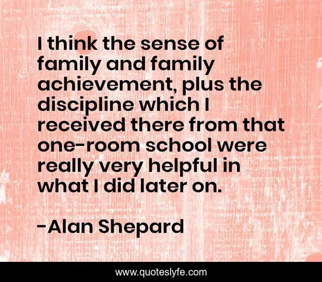 This page presents the quote "I think the sense of family and family achievement, plus the discipline which I received there from that one-room school were really very helpful in what I did later on.". Author of this quote is Alan Shepard. This quote is about discipline, family, accomplishments, goals, inspirational, enthusiasm, achievement,.