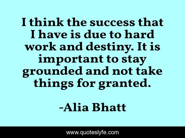This page presents the quote "I think the success that I have is due to hard work and destiny. It is important to stay grounded and not take things for granted.". Author of this quote is Alia Bhatt. This quote is about destiny, success, hard work,.