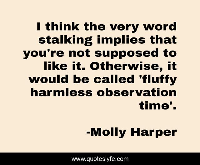 This page presents the quote "I think the very word stalking implies that you're not supposed to like it. Otherwise, it would be called 'fluffy harmless observation time'.". Author of this quote is Molly Harper. This quote is about labels, humor, stalking,.