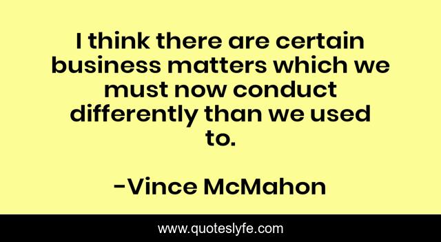 This page presents the quote "I think there are certain business matters which we must now conduct differently than we used to.". Author of this quote is Vince McMahon. This quote is about matters, now, think,.
