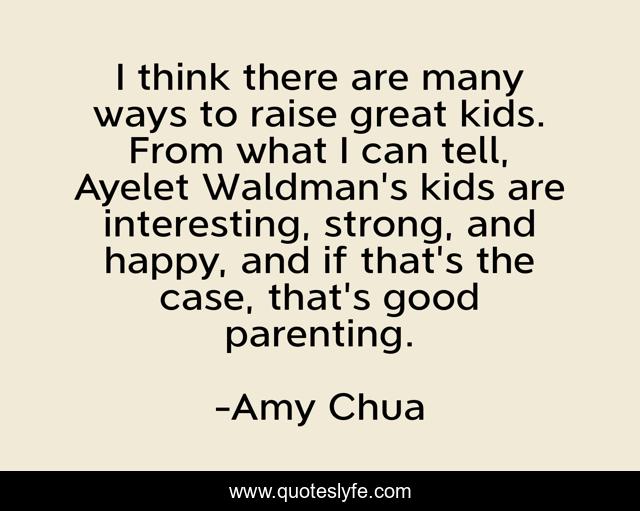 This page presents the quote "I think there are many ways to raise great kids. From what I can tell, Ayelet Waldman's kids are interesting, strong, and happy, and if that's the case, that's good parenting.". Author of this quote is Amy Chua. This quote is about great, good, happy,.