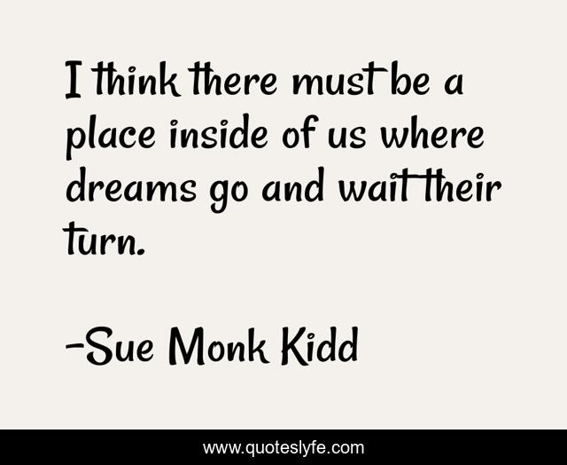 This page presents the quote "I think there must be a place inside of us where dreams go and wait their turn.". Author of this quote is Sue Monk Kidd. This quote is about place, think, wait,.