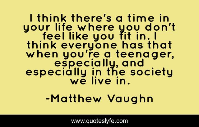 This page presents the quote "I think there's a time in your life where you don't feel like you fit in. I think everyone has that when you're a teenager, especially, and especially in the society we live in.". Author of this quote is Matthew Vaughn. This quote is about society, life, time,.