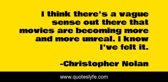 This page presents the quote "I think there's a vague sense out there that movies are becoming more and more unreal. I know I've felt it.". Author of this quote is Christopher Nolan. This quote is about think, sense,.