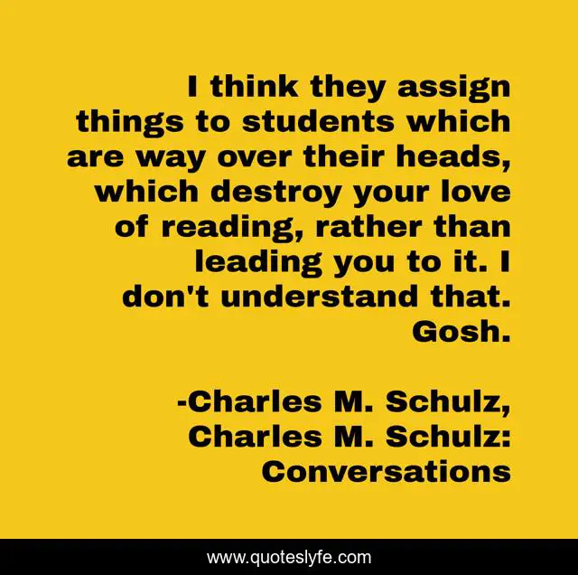 This page presents the quote "I think they assign things to students which are way over their heads, which destroy your love of reading, rather than leading you to it. I don't understand that. Gosh.". Author of this quote is Charles M. Schulz, Charles M. Schulz: Conversations. This quote is about school, curriculum, reading,.