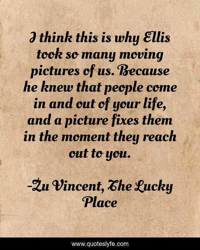 This page presents the quote "I think this is why Ellis took so many moving pictures of us. Because he knew that people come in and out of your life, and a picture fixes them in the moment they reach out to you.". Author of this quote is Zu Vincent, The Lucky Place. This quote is about relationships, movies, zu-vincent, photos, the-lucky-place,.
