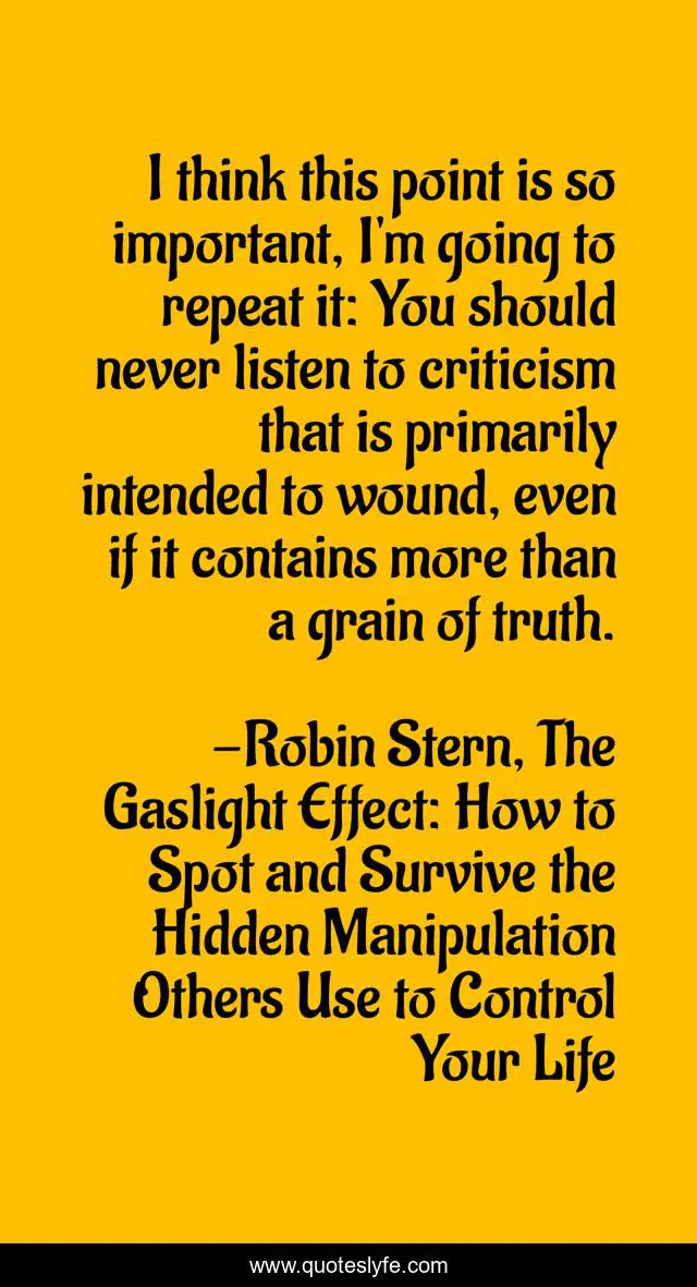 This page presents the quote "I think this point is so important, I'm going to repeat it: You should never listen to criticism that is primarily intended to wound, even if it contains more than a grain of truth.". Author of this quote is Robin Stern, The Gaslight Effect: How to Spot and Survive the Hidden Manipulation Others Use to Control Your Life. This quote is about psychology, emotional-abuse,.