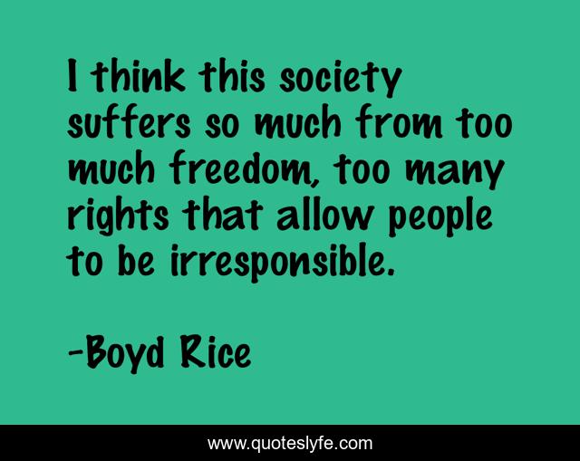 This page presents the quote "I think this society suffers so much from too much freedom, too many rights that allow people to be irresponsible.". Author of this quote is Boyd Rice. This quote is about freedom, think, people,.