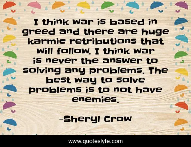 This page presents the quote "I think war is based in greed and there are huge karmic retributions that will follow. I think war is never the answer to solving any problems. The best way to solve problems is to not have enemies.". Author of this quote is Sheryl Crow. This quote is about problems, best, greed,.
