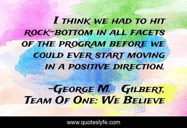 This page presents the quote "I think we had to hit rock-bottom in all facets of the program before we could ever start moving in a positive direction.". Author of this quote is George M. Gilbert, Team Of One: We Believe. This quote is about team-direction, confidence, football, success, positive, motivational, winning, coaching, optimistic,.