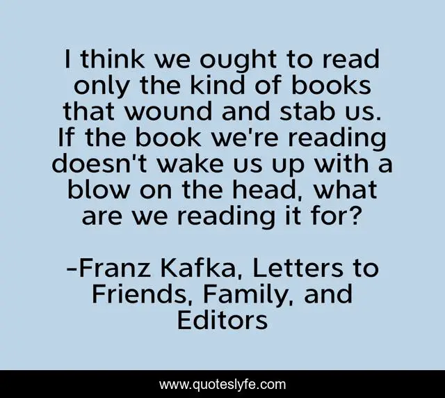 This page presents the quote "I think we ought to read only the kind of books that wound and stab us. If the book we’re reading doesn’t wake us up with a blow on the head, what are we reading it for?". Author of this quote is Franz Kafka, Letters to Friends, Family, and Editors. This quote is about books, literature, reading, words,.