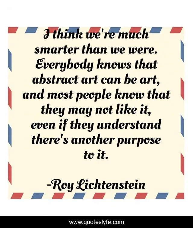 This page presents the quote "I think we're much smarter than we were. Everybody knows that abstract art can be art, and most people know that they may not like it, even if they understand there's another purpose to it.". Author of this quote is Roy Lichtenstein. This quote is about purpose, people,.
