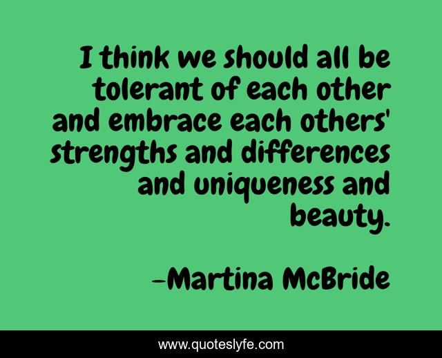This page presents the quote "I think we should all be tolerant of each other and embrace each others' strengths and differences and uniqueness and beauty.". Author of this quote is Martina McBride. This quote is about differences, think,.