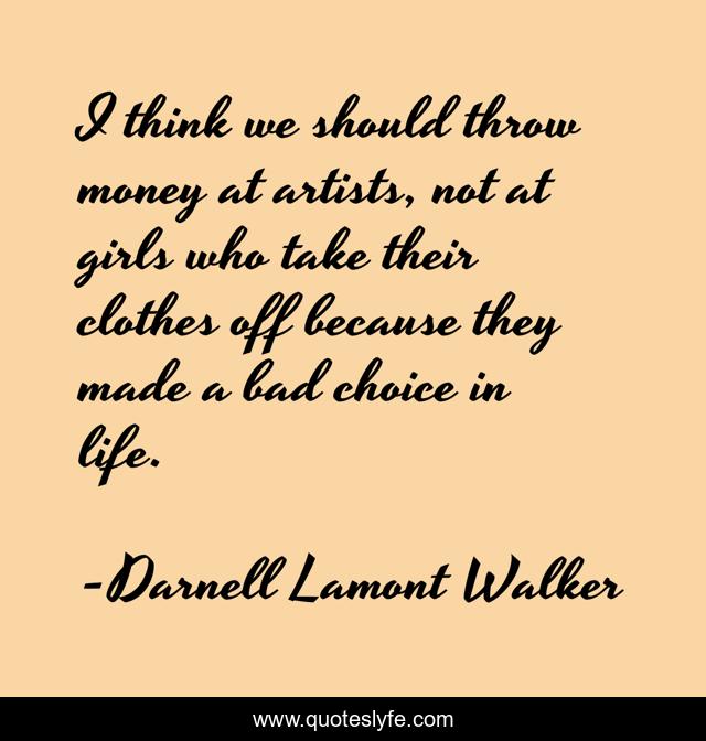 This page presents the quote "I think we should throw money at artists, not at girls who take their clothes off because they made a bad choice in life.". Author of this quote is Darnell Lamont Walker. This quote is about artists, strippers,.
