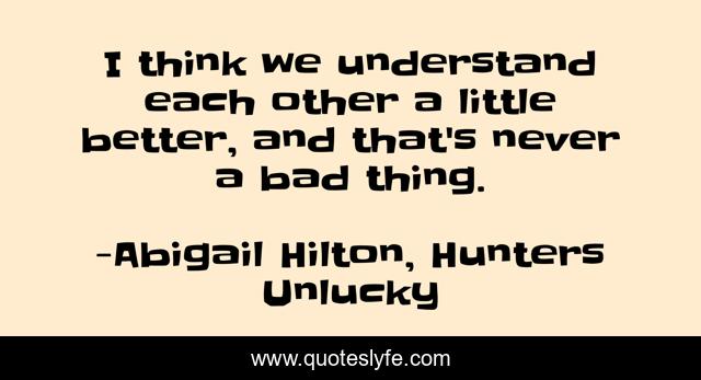 This page presents the quote "I think we understand each other a little better, and that's never a bad thing.". Author of this quote is Abigail Hilton, Hunters Unlucky. This quote is about understanding-others, understanding,.
