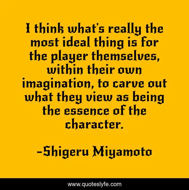 This page presents the quote "I think what's really the most ideal thing is for the player themselves, within their own imagination, to carve out what they view as being the essence of the character.". Author of this quote is Shigeru Miyamoto. This quote is about character, think, view,.