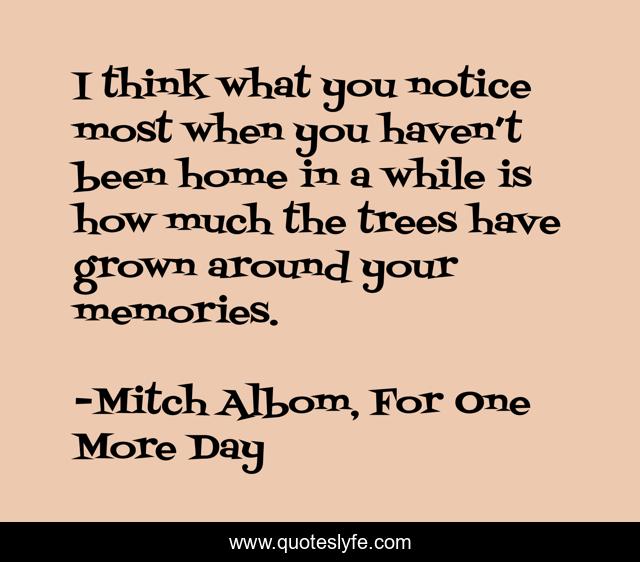 This page presents the quote "I think what you notice most when you haven’t been home in a while is how much the trees have grown around your memories.". Author of this quote is Mitch Albom, For One More Day. .