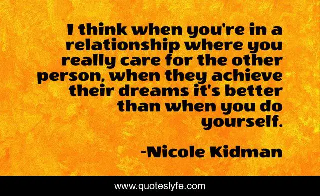 This page presents the quote "I think when you're in a relationship where you really care for the other person, when they achieve their dreams it's better than when you do yourself.". Author of this quote is Nicole Kidman. This quote is about relationship, yourself,.