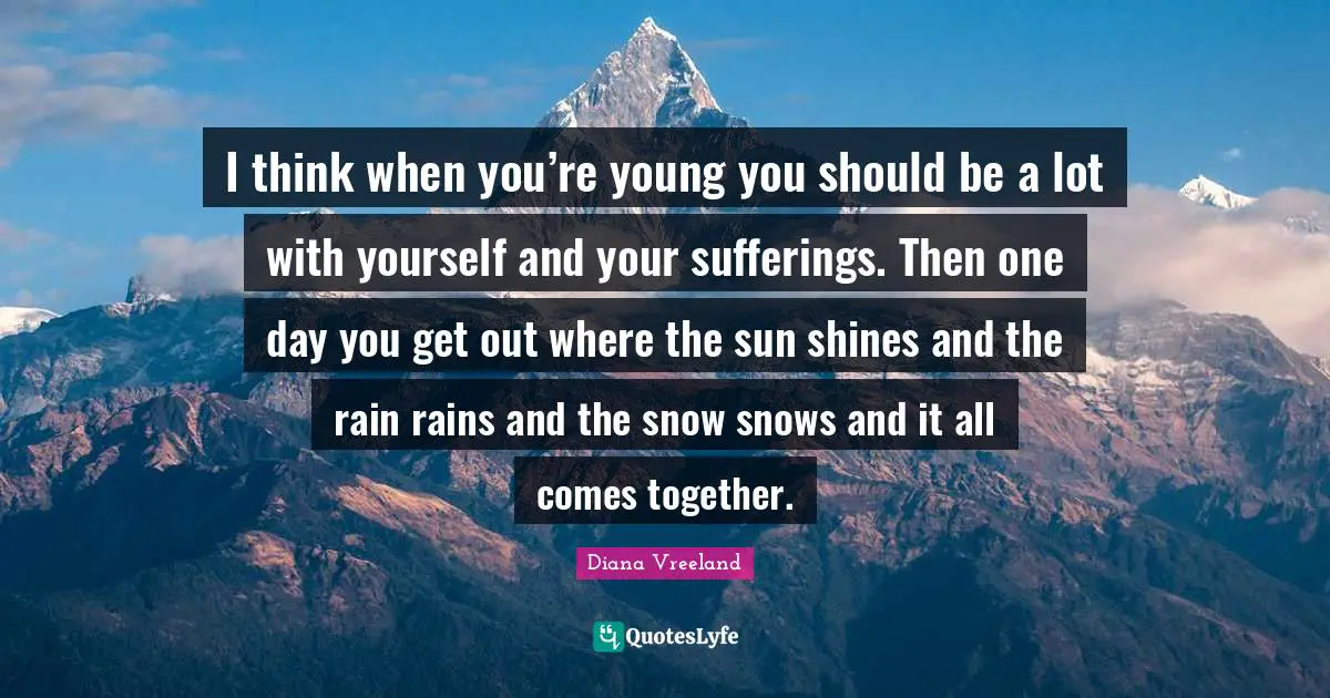 This page presents the quote "I think when you’re young you should be a lot with yourself and your sufferings. Then one day you get out where the sun shines and the rain rains and the snow snows and it all comes together.". Author of this quote is Diana Vreeland. This quote is about rain, snow, together, sun shines, one day, inspirational, thinking, young,.