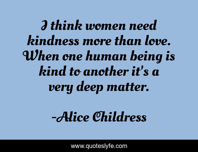 This page presents the quote "I think women need kindness more than love. When one human being is kind to another it's a very deep matter.". Author of this quote is Alice Childress. This quote is about helping, people,.