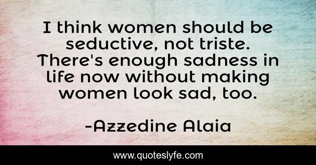 This page presents the quote "I think women should be seductive, not triste. There's enough sadness in life now without making women look sad, too.". Author of this quote is Azzedine Alaia. This quote is about life, sadness, women,.