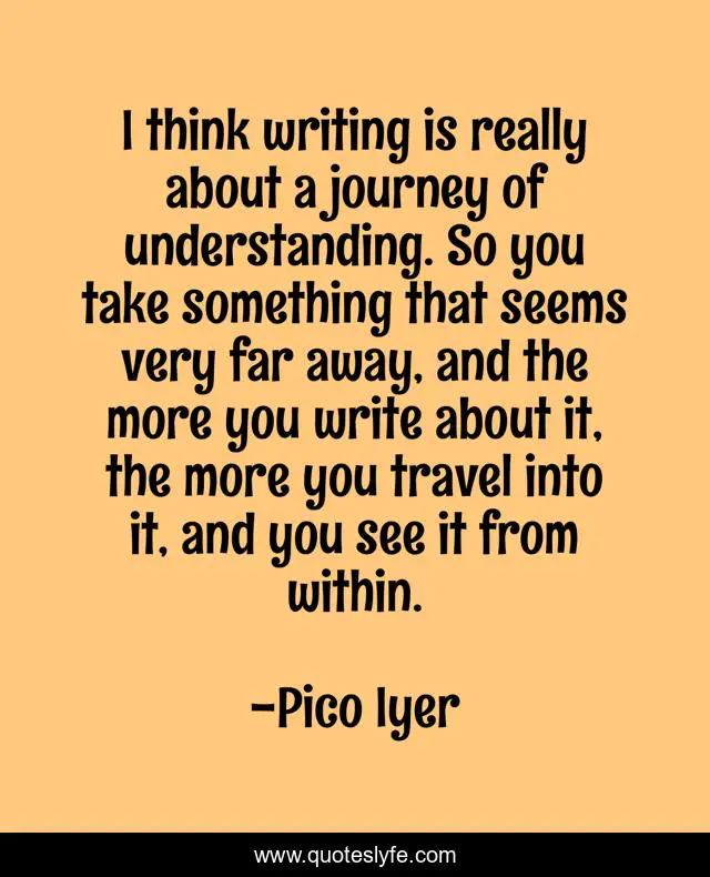 This page presents the quote "I think writing is really about a journey of understanding. So you take something that seems very far away, and the more you write about it, the more you travel into it, and you see it from within.". Author of this quote is Pico Iyer. This quote is about journey, writing,.