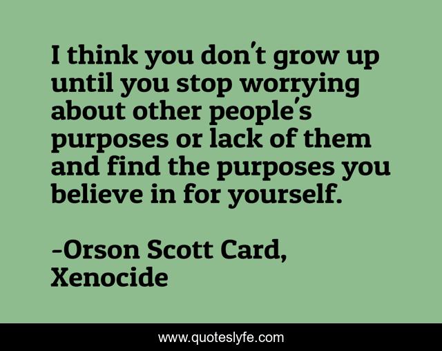 This page presents the quote "I think you don't grow up until you stop worrying about other people's purposes or lack of them and find the purposes you believe in for yourself.". Author of this quote is Orson Scott Card, Xenocide. This quote is about ender, andrew-wiggin, life-lessons, inspiration,.