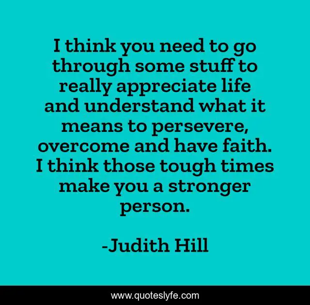 This page presents the quote "I think you need to go through some stuff to really appreciate life and understand what it means to persevere, overcome and have faith. I think those tough times make you a stronger person.". Author of this quote is Judith Hill. This quote is about tough times, life, stronger,.