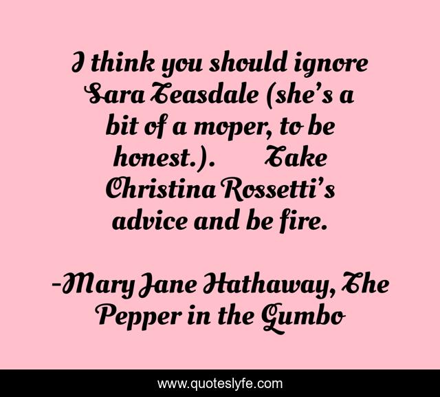 This page presents the quote "I think you should ignore Sara Teasdale (she’s a bit of a moper, to be honest.). Take Christina Rossetti’s advice and be fire.". Author of this quote is Mary Jane Hathaway, The Pepper in the Gumbo. This quote is about fire, love, poetry, affection,.