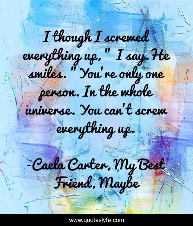 This page presents the quote "I though I screwed everything up, " I say.He smiles. "You're only one person. In the whole universe. You can't screw everything up.". Author of this quote is Caela Carter, My Best Friend, Maybe. This quote is about humor, advice, screw-ups, romance, screwed-up, screwing-up, insecure,.