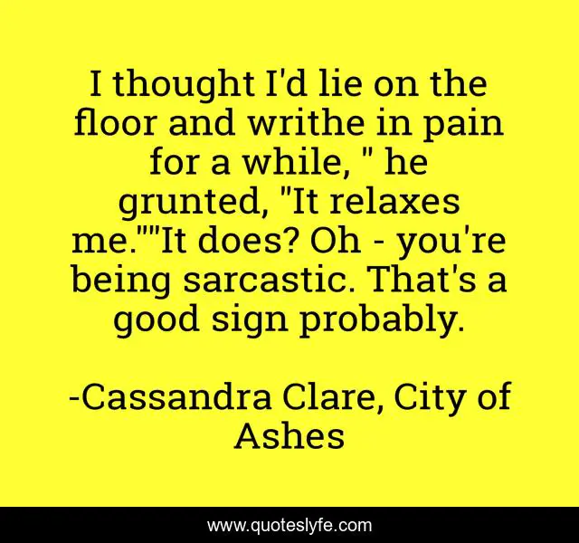 This page presents the quote "I thought I'd lie on the floor and writhe in pain for a while, " he grunted, "It relaxes me.""It does? Oh - you're being sarcastic. That's a good sign probably.". Author of this quote is Cassandra Clare, City of Ashes. This quote is about funny, comedy, humor,.