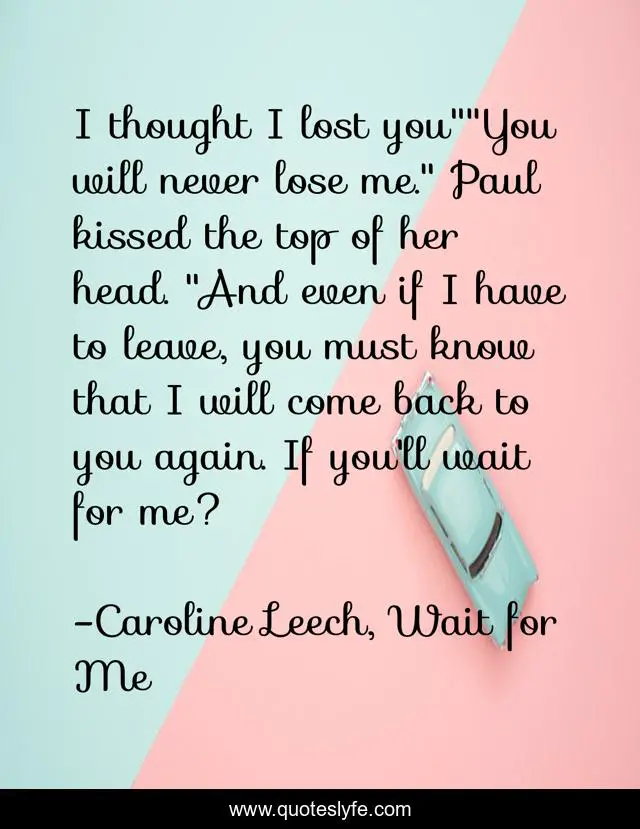 This page presents the quote "I thought I lost you""You will never lose me." Paul kissed the top of her head. "And even if I have to leave, you must know that I will come back to you again. If you'll wait for me?". Author of this quote is Caroline Leech, Wait for Me. This quote is about waiting, love, war, affection,.