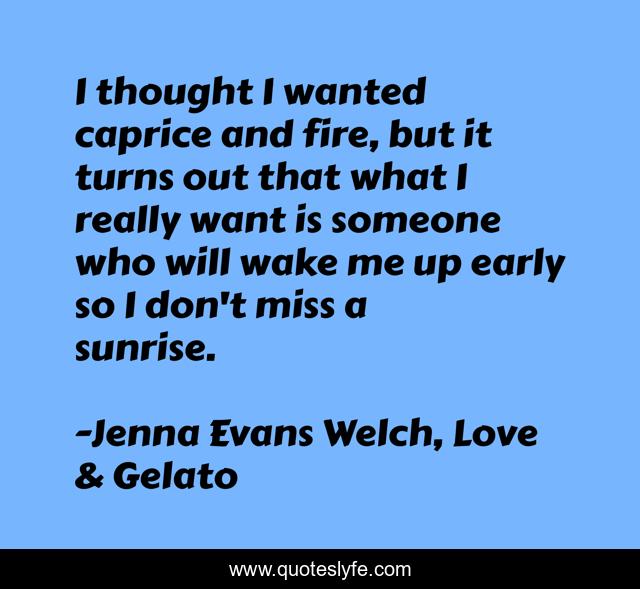 This page presents the quote "I thought I wanted caprice and fire, but it turns out that what I really want is someone who will wake me up early so I don't miss a sunrise.". Author of this quote is Jenna Evans Welch, Love & Gelato. This quote is about beautiful, romance, love, sunrise, affection,.